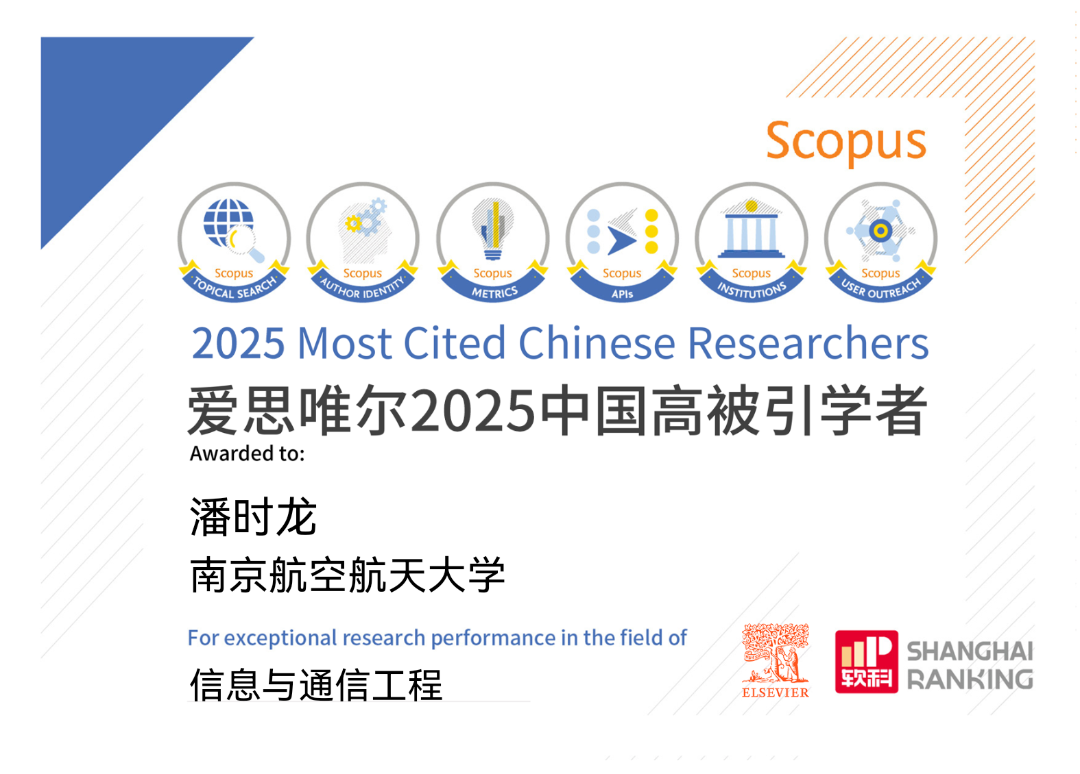 我院潘时龙、张小飞、张方正三位教授入选爱思唯尔2025“中国高被引学者”榜单